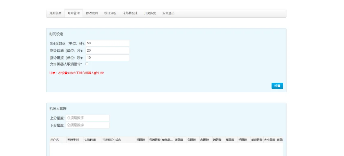 开奖对接的是168,可以正常采集开奖结算,测试除了功能单一其他也还行,总后台没有开下级代理账户的地方,前端需要在机器人后台创建玩家后复制对应链接才可以进入